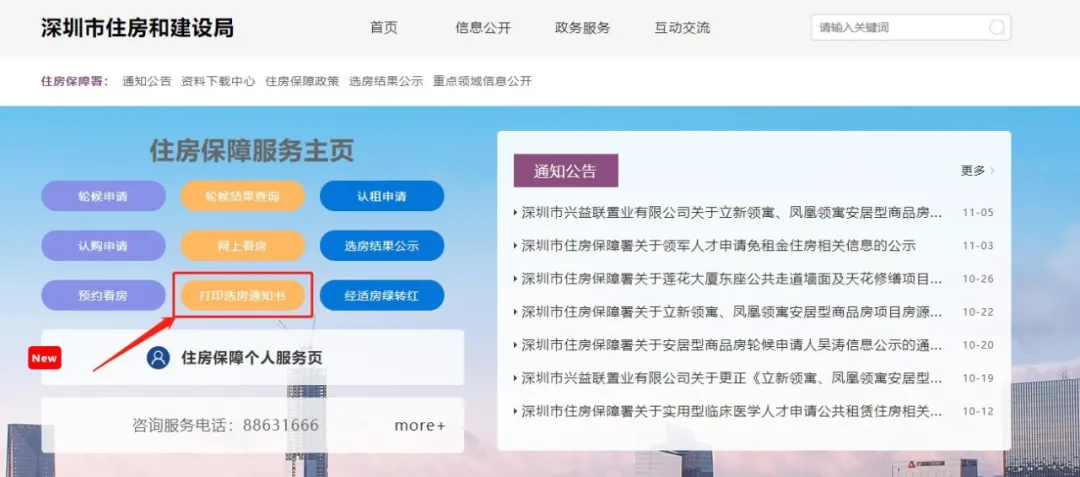 入围及候补入围认购家庭的选房时间为2020年11月8日至11月13日上午场,房源选完即止。具体选房时间安排详见附件。入围及候补入围认购家庭应于2020年11月6日9:00起进入深圳市住房和建设局网站—>“政务服务”—>“服务主题”—>“住房保障服务”—>“住房保障服务主页”—>“打印选房通知书”,在线打印选房通知书。