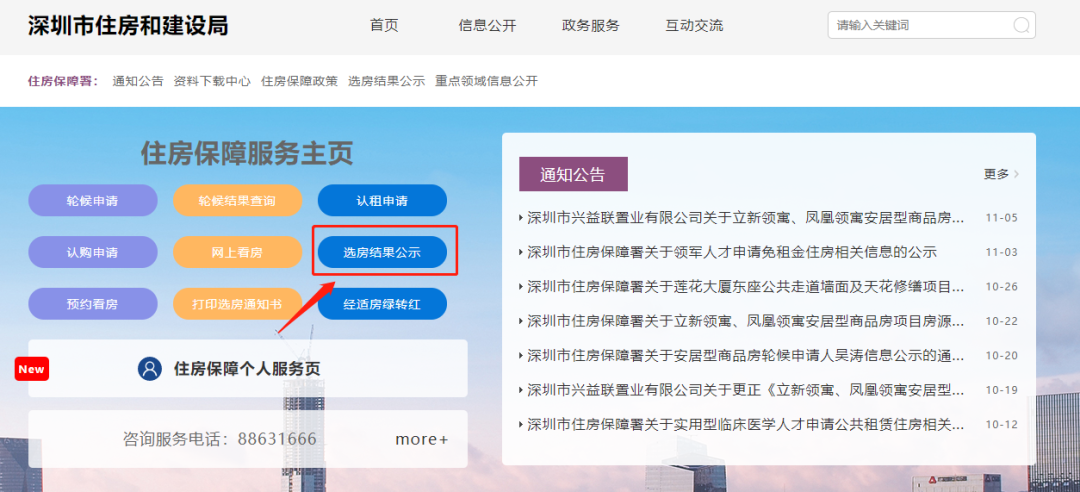 6、选房期间,每天选房工作结束后,于当日22:00前,在深圳市住房和建设局网站—>“政务服务”—>“服务主题”—>“住房保障服务”—>“住房保障服务主页”—>“选房结果公示”专栏公布选房结果。
