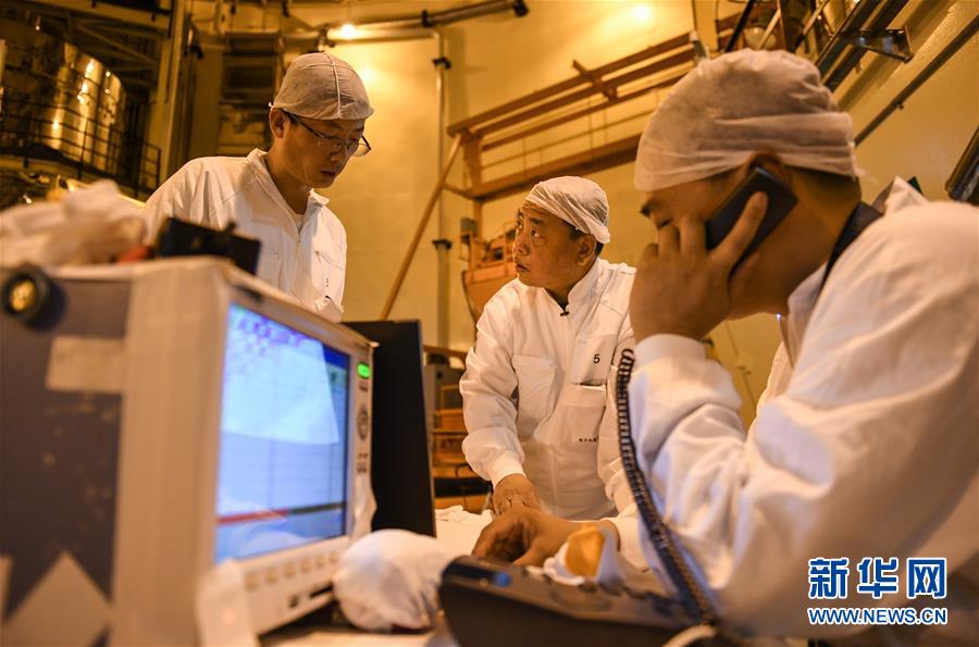 2019年4月12日,在深圳大亚湾核电站2号机组核心区,乔素凯(中)与团队成员一起了解换料的情况。新华社记者毛思倩摄