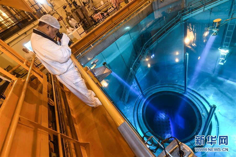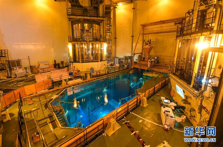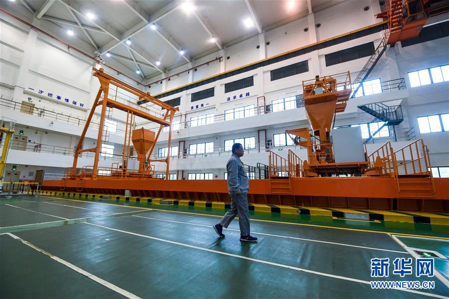 2019年4月12日,在深圳大亚湾核电基地中广核核电运营公司技能培训中心,乔素凯从1比1比例建造的模拟换料水池旁走过。平时,乔素凯和团队成员都是在此进行培训,在每次修复组件之前,团队会用模拟的组件进行全方位的演练。新华社记者毛思倩摄