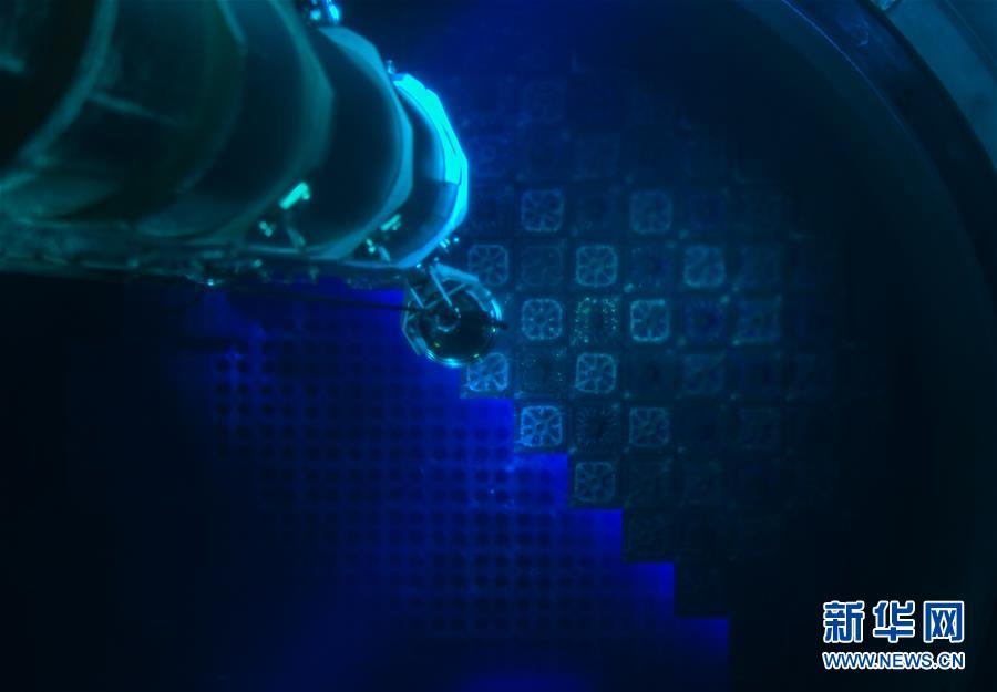2019年4月12日,在深圳大亚湾核电站2号机组核心区,乔素凯操作设备进行水下核燃料组件的更换工作。新华社记者毛思倩摄