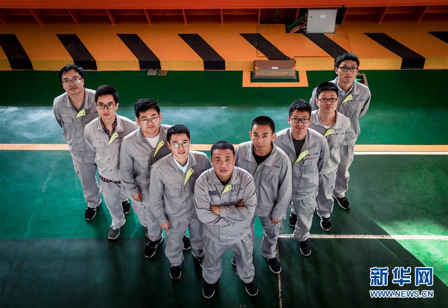 2019年11月20日,在深圳大亚湾核电基地中广核核电运营公司技能培训中心,乔素凯(中)与团队成员合影。新华社记者毛思倩摄