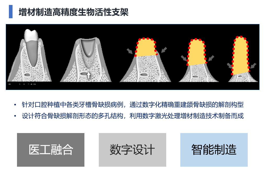”我们从16年开始着手这个项目,围绕口腔临床实际需求,不断迭代升级。“创始人王超说。本产品针对口腔种植中各类牙槽骨缺损病例,通过数字化精确重建颌骨缺损的解剖构型,并且设计符合缺损解剖形态的多孔结构,利用激光处理增材制造技术制备而成。具有利于术中精准植入、增强成骨活性效能、降低并发症发生概率等优势。