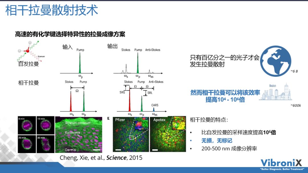 “系统灵敏度高,可以在10min内观测到细菌代谢变化。相对于传统的耐药菌药敏测试判定方法,我们用代谢法,节省48小时。“创始人王璞介绍到。Vibroni X是创新型无标记成像平台,目标是为疾病诊断和治疗提供先进的成像和传感器技术,项目专注于开发外科指导的光学和声学技术。相干拉曼散射技术是利用高速的化学键选择特异性的拉曼成像方案,相干拉曼散射显微镜已经应用到了细胞脂类代谢组学、病理组织学分型、合成生物学、药物制剂评估等方面上。