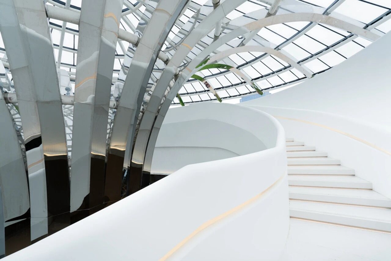 室内空间游览路径借鉴古代文人雅集“曲水流觞”意境,形态各异的楼梯与坡道被赋予浪漫寓意——既是可攀登、可停留的“书山”,也是引导动线的“玉带”,蜿蜒流转间串联起各个功能区,让行走成为沉浸式文化漫游。