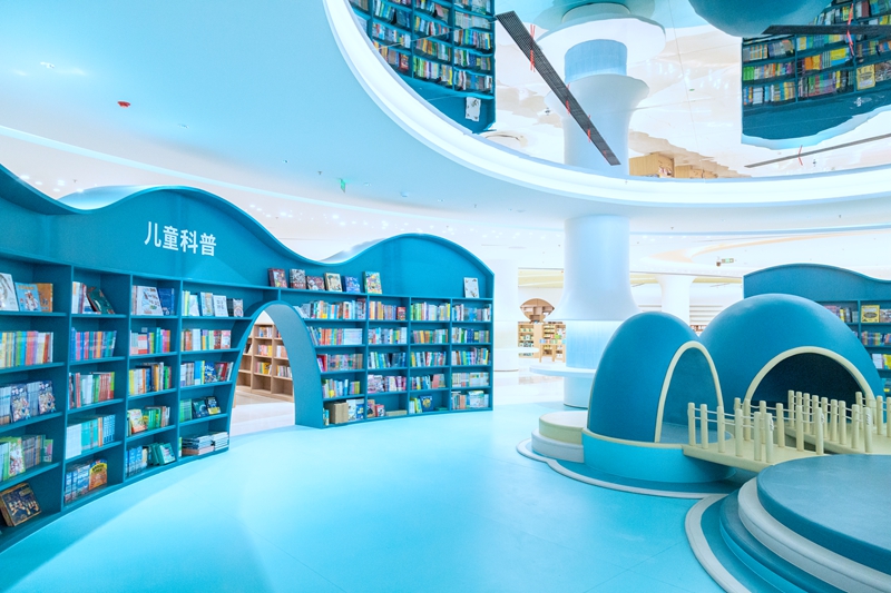 阅读空间各具特色。北区一层近3000㎡的人文万象主题阅读空间,陈列人文、历史、哲学类书籍,殿堂式入口搭配柔和灯光营造庄重开放的氛围,还通过空间划分打造“小型图书文化展”,并联合知名品牌设特色主题空间、提供会员定制服务;南区负一层2000㎡的欢乐META空间,空间设计充满童趣,以缤纷色彩与星辰大海元素为主体,半球形的阅读角、小桥造型的连接通道,宛如一个小型的童话世界,将绘本阅读、成长探索与社交实践融合,成为青少年的“沉浸式学习乐园”。