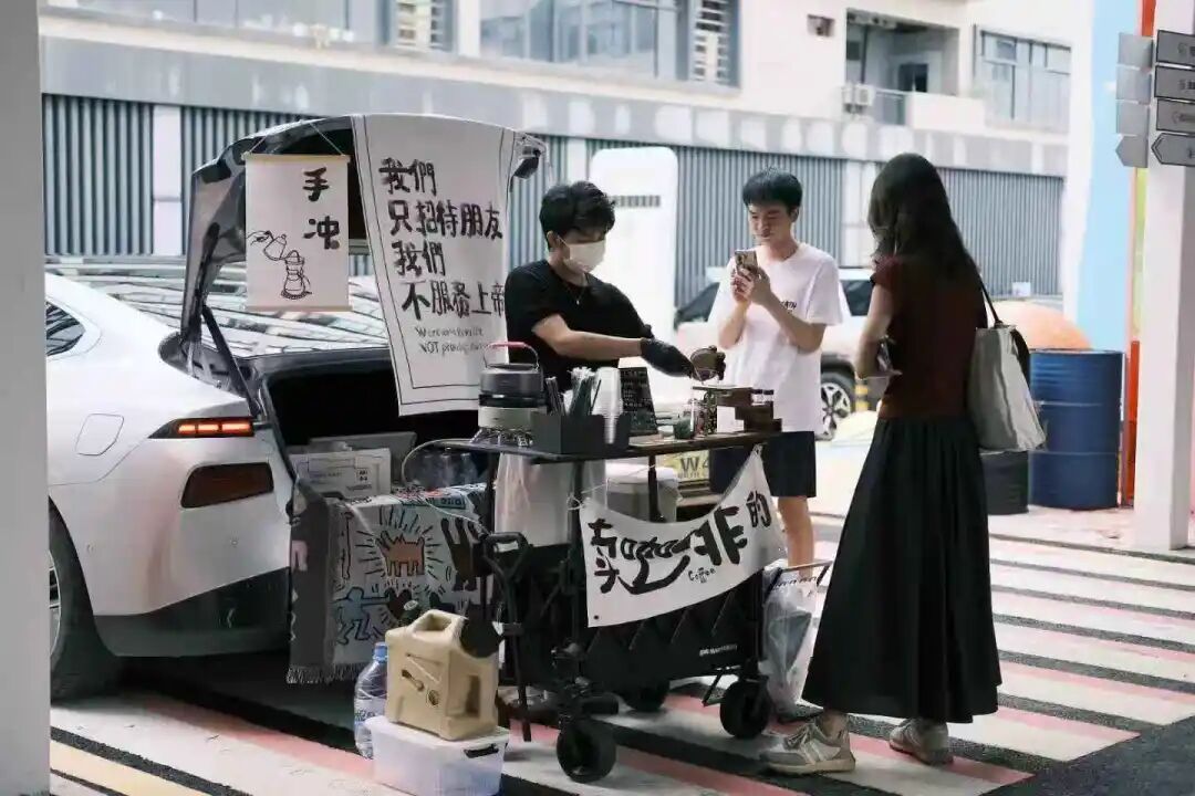 “欢迎各位精神股东来到我的直播间,今天我的移动咖啡店来到了宝安沙井,欢迎附近的朋友前来打卡品尝!”