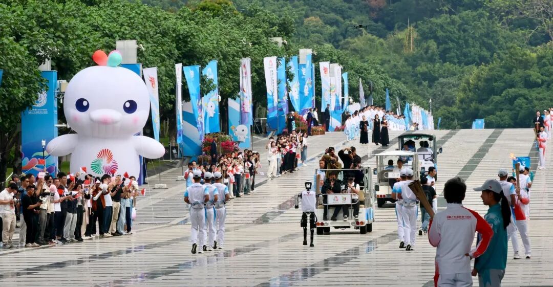 火炬传递沿途展演还设置了机器狗、无人船等科技互动场景,以展示深圳前沿科技应用成果,让观众近距离感受“科技深圳”的魅力与活力。