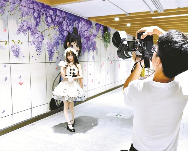 深圳地铁岗厦北枢纽创新推出的“簪花少女”墙绘打卡点。 深圳特区报记者 刘羽洁 摄