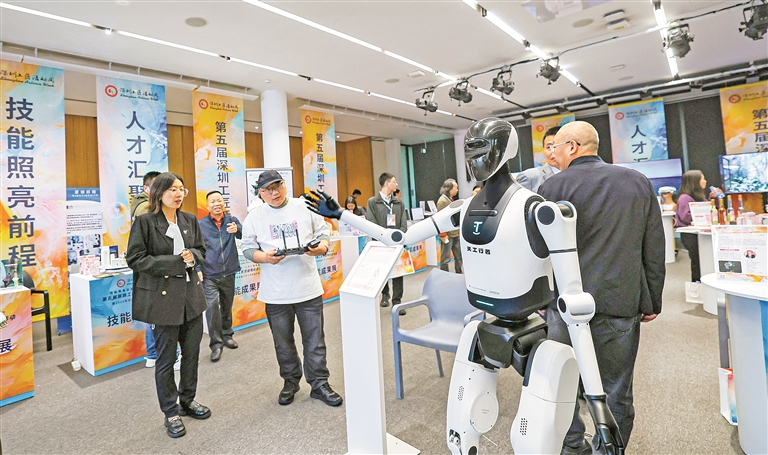 活动现场亮点纷呈。在深圳人才公园深爱人才厅,国家级重大主题展览“一带一路”中国技术技能主题展首次在深设展,生动呈现技能人才在“一带一路”共建国家基础设施建设、产业技术升级、技能人才培育等领域的实践历程。活动现场设置技能成果展区,共67家单位集中展示深圳技能人才在高端制造、人工智能、生物科技、民生热点、非遗传承等领域的技术技改成果。“‘机’动未来·匠星闪耀”机器人技能表演赛开赛,来自十余家公司的机器人轮流登场,同台竞“技”,展示前沿技能魅力。