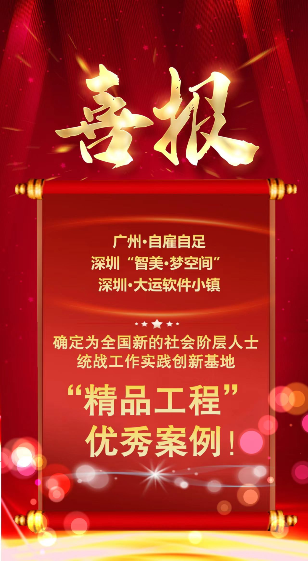 近日,我省“广州·自雇自足”“深圳‘智美·梦空间’”“深圳·大运软件小镇”等3个新的社会阶层人士统战工作实践创新基地,成功入选全国新的社会阶层人士统战工作实践创新基地“精品工程”优秀案例。