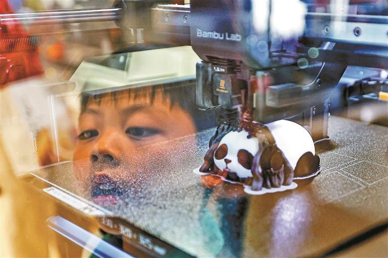 拓竹3D打印店里,一只憨态可掬的3D打印熊猫牢牢锁住了孩子的目光。