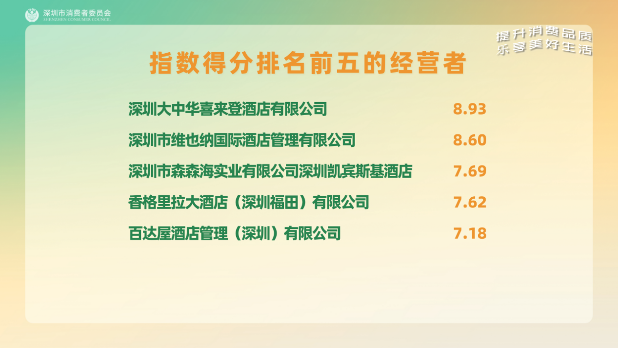 酒店住宿是商务出行、旅游度假中不可或缺的一环,为进一步提升酒店住宿行业消费品质,助力消费者“选得放心,住得安心”,深圳市消委会发布酒店住宿行业315消费通经营者投诉处理指数排行榜,此次共涉及40家经营者,旨在指引消费者选择重信誉、守信用的经营者,督促酒店住宿经营者提升自身服务质量,以促进酒店住宿行业更透明、更规范、更高质量发展。