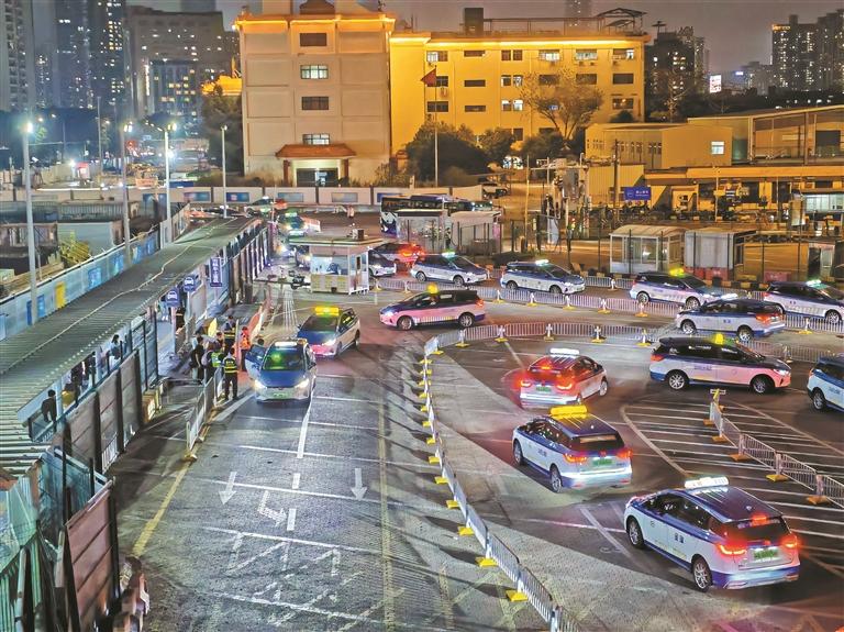 ▲皇岗口岸进场出租车在场地内排队候客。深圳报业集团记者 董玉含 摄