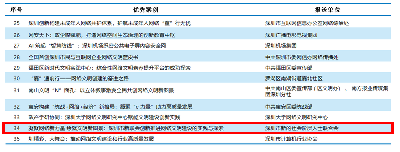 其中,深圳市新的社会阶层人士联合会(简称“深圳市新联会”)报送的“凝聚网络新力量 绘就文明新图景——深圳市新联会创新推进网络文明建设的实践与探索”案例成功入选优秀案例,成为深圳网络文明建设多元共治格局中的闪亮一环,为全国网络文明建设贡献了“新联智慧”与“深圳样本”。
