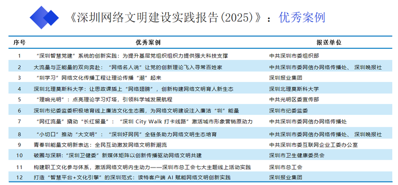 近日,由中共深圳市委网信办与深圳大学传播学院联合编写的《网络文明蓝皮书:深圳网络文明建设实践报告(2025)》(以下简称“2025网络文明蓝皮书”)在2025“网络文明之光耀鹏城”网络传播活动上正式发布。作为网络文明蓝皮书三部曲的收官之作,该报告系统梳理了近五年深圳网络文明建设的实践成果与创新经验,并公布了35个代表性强、创新度高的优秀实践案例。